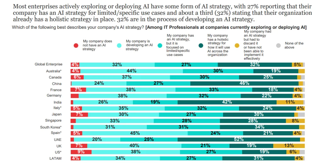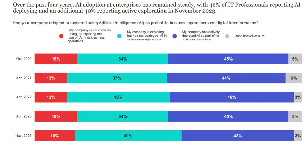 According to the 2024 IBM Global AI Adoption Index, 42% of large enterprises have actively deployed AI, while another 40% are still exploring or experimenting without having deployed.