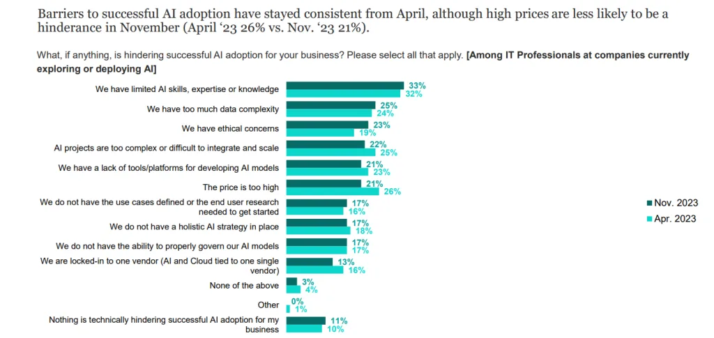 According to the 2023 IBM Global AI Adoption Index, 33% of enterprises cite limited AI skills and expertise as the top barrier to AI adoption, ranking ahead of data complexity (25%), ethical concerns (23%), and integration difficulty.