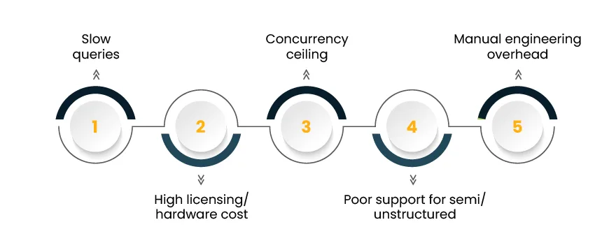 Legacy data warehouses often surface limitations when the load grows, or the reporting requirements broaden. These limitations come from design assumptions that made sense when the systems were first built. Over time, those assumptions stopped matching how workloads evolved.