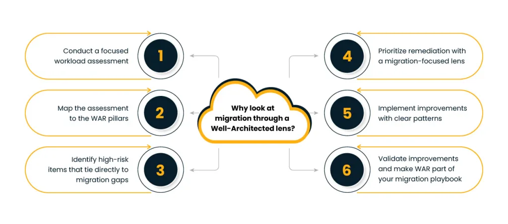 Diagram idea: A loop that starts at “New migration,” flows through “Initial go-live,” then “Targeted WAR,” “Focused remediation,” and “Measured improvement,” and finally feeds into “Patterns for future migrations.” It is a continuous feedback loop for your cloud journey.